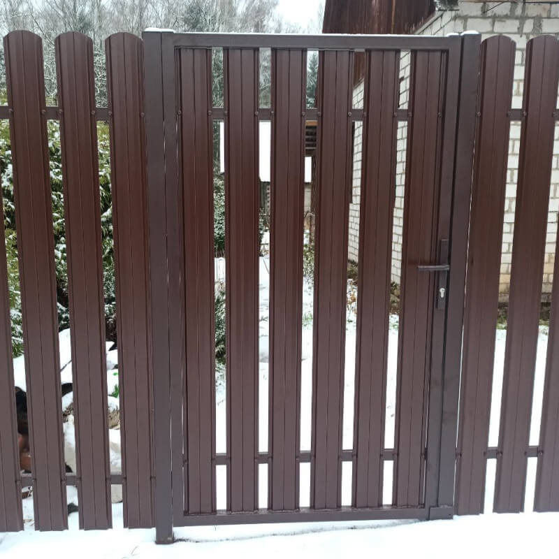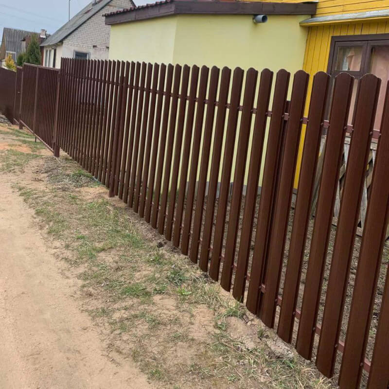 - забор из металлического штакетника (металлоштакетника более популярное название, получил широкую популярность благодаря прочности и доступной цене. Имеет внешний вид "классического" забора),